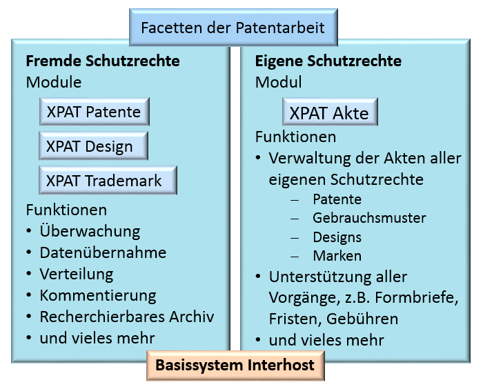 Daneben gibt es die XPAT Werkzeuge für eigene Schutzrechte, wie Patente, Marken, Designs aber auch Lizenz- und sonstige Verträge, Patenteinsprüche und Erfindungen. Die Bewertung von Patenten ist ein wichtiger Schritt, um zu klären, welche eigene Patente aufrechterhalten werden sollen. Aber auch Einsprüche in Einspruchsakten, Korrespondenz mit den Anwälten, Erfindervergütung, Aufrechterhaltung und Lizenzierungen werden durch XPAT Akte abgedeckt. Eine Anbindung an einen Gebührendienstleister ist vorhanden.(->XPAT Akte)